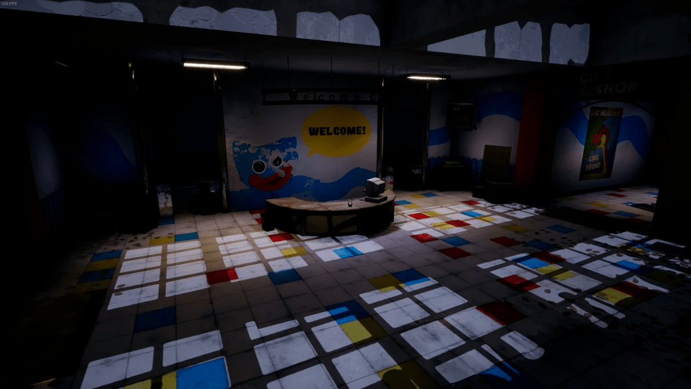 El vestíbulo principal de los visitantes de la fábrica de Playtime Co. que incluye múltiples puertas que conducirán a las habitaciones. (Ten en cuenta que casi todas estas habitaciones están sin terminar y no se puede acceder a ellas en absoluto) | None |