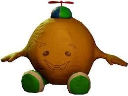 Kick-me-Paul es una pelota marrón anaranjada con un sombrero de hélice multicolor. tiene zapatos verdes con una raya blanca en cada zapato. Parece estar hecho de una sustancia parecida al cuero. También tiene brazos pequeños y parece tener una cara feliz.