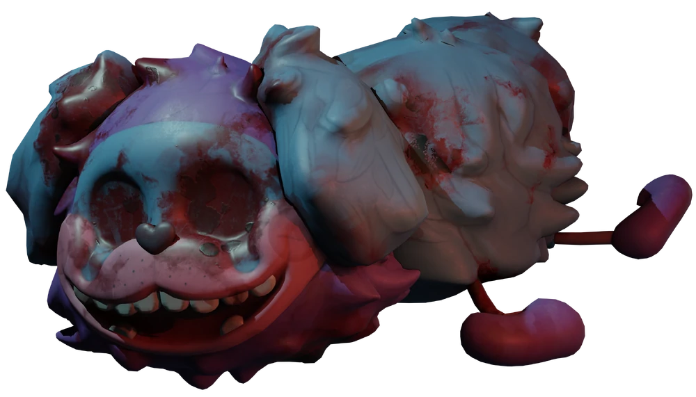 En el tráiler del Capítulo 2, que se supone que es su diseño original, parece ser un ciempiés púrpura gigante con ojos negros y antenas aparentemente azules o rojas, junto con una nariz roja.